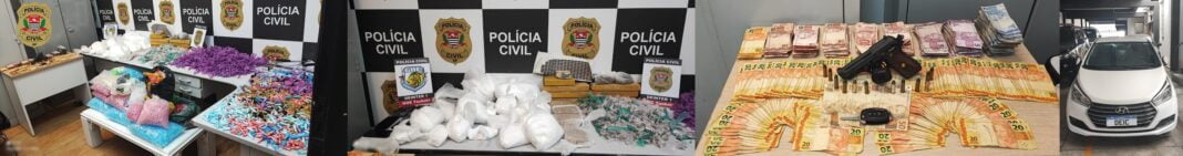 Durante a ação, os agentes apreenderam mais de 25 kg de drogas, incluindo dois tijolos de crack, 16 pacotes de cocaína, sete tijolos de maconha e mais de 2.200 ‘pinos’ de cocaína, além de uma pistola Taurus calibre .380 com sete munições. Também foram apreendidos cinco celulares, aproximadamente R$ 10 mil em espécie, adesivos para identificar a droga, diversas anotações do tráfico, três balanças grandes e duas pequenas para medição, três facas utilizadas para fracionar a droga e um veículo.