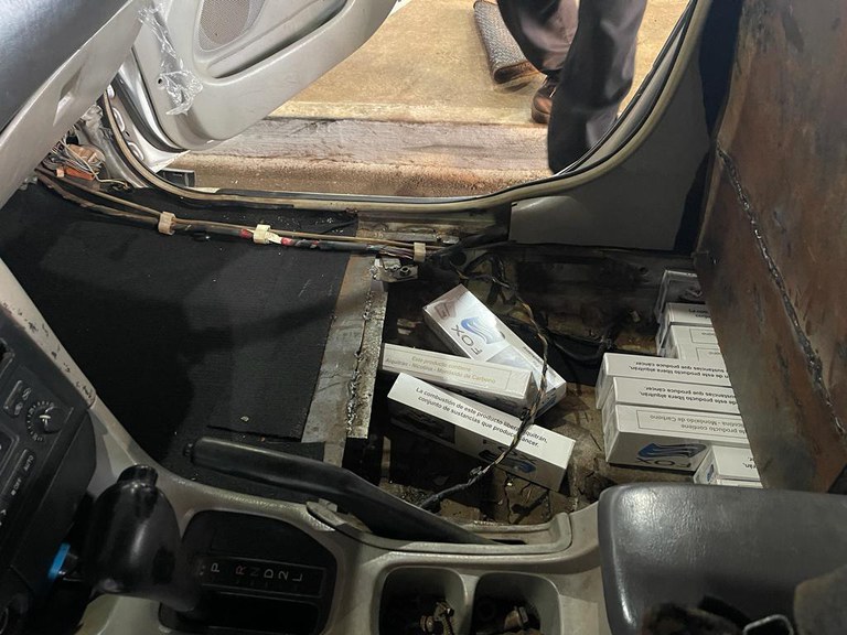 Nesta quinta-feira (16/11), policiais federais e servidores da Receita Federal realizavam fiscalização aduaneira quando pararam um veículo. Ao vistoriar o carro, com placas paraguaias, foi encontrado um fundo falso contendo cerca de 200 pacotes de cigarros contrabandeados do Paraguai.
