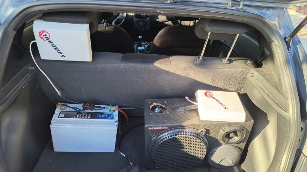 Durante a vistoria no carro, os policiais encontraram duas antenas instaladas no encosto dos bancos e um equipamento de transmissão que estava acoplado em uma caixa de som automotivo. O gerenciamento das antenas era realizado por um aplicativo de celular.